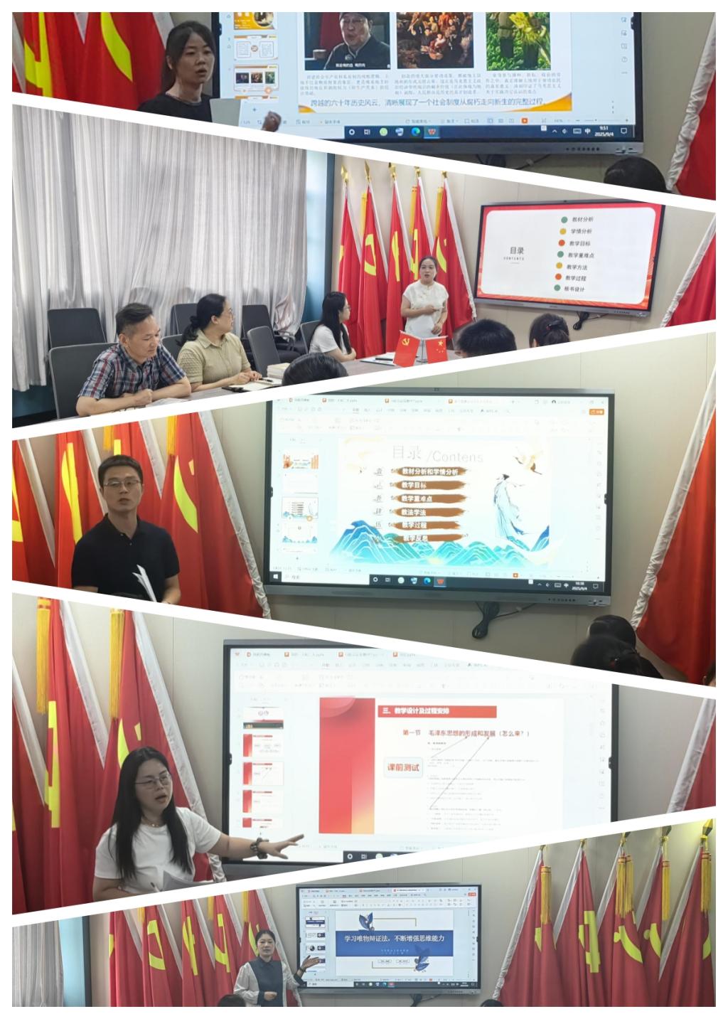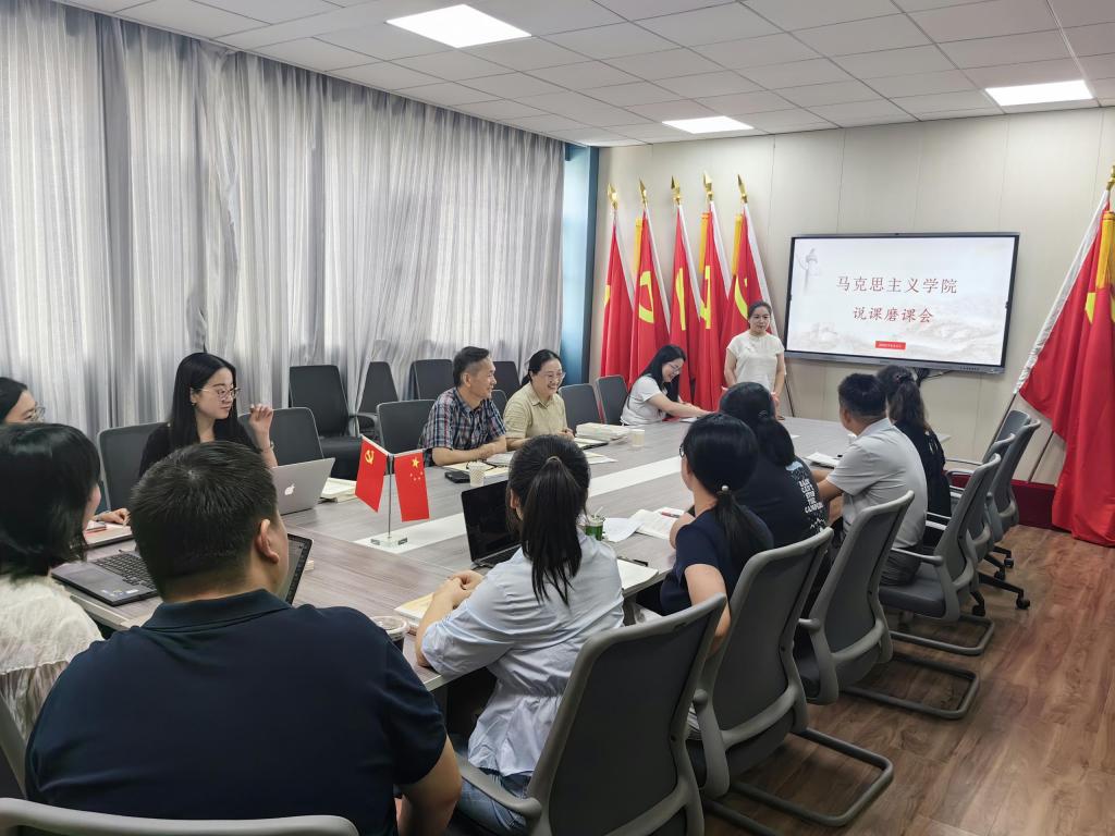 活动中,5名新开课教师围绕课程设计、教学重难点及教学方法展开说课。《党史》课程教师刘蜜运用历史影像、地图、会议旧址等视觉化素材,动态呈现党的一大代表行程路线与会议成果关联,引导学生从党史中汲取奋进力量。《马克思主义基本原理》教师曾婧以理论+现实进行教案设计,将课程内容与现实相结合,增强学生理论认同。《毛泽东思想和中国特色社会主义理论体系概论》教师程晓玲运用毛泽东经典语录牌卡游戏与学生展开互动,加深学生对课程的理解。《习近平新时代中国特色社会主义思想概论》教师宋杰通过建设社会主义文化强国导入课程,帮助学生深刻认识到中华优秀传统文化是中华民族的根和魂,引导学生对新时代中国特色社会主义文化建设学深悟透,真正做到学、思、用贯通、知行合一,用实际行动推动社会主义文化繁荣兴盛;彭宜君老师以通过“2036年奥运申办”“高考填志愿”“春节晚会的组织”等案例,帮助学生理解辩证思维方法,推动理论教学与社会现实深度结合。