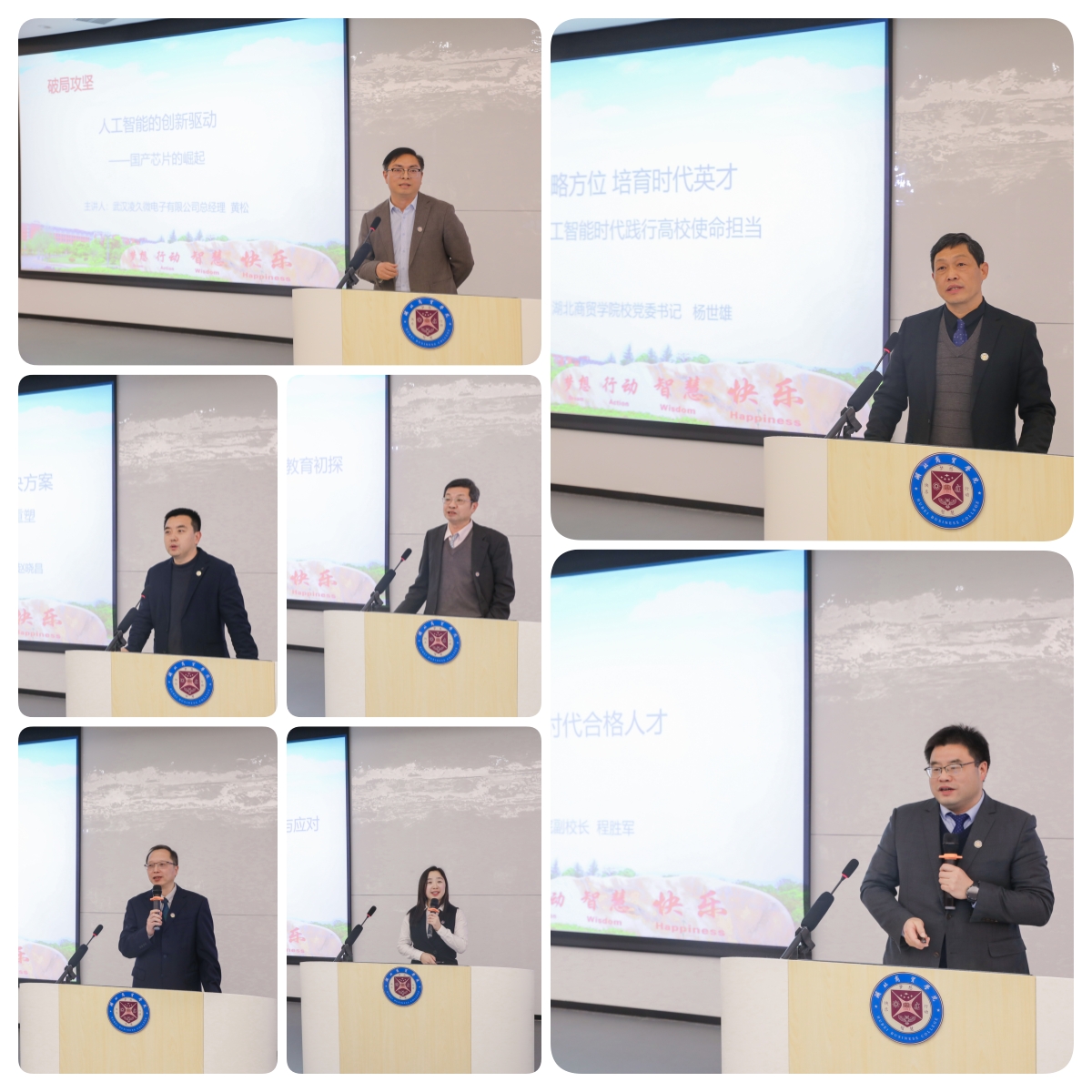 主题教学环节拉开序幕,七位讲授人依次登台。主讲人杨世雄以《锚定战略方位 培育时代英才》开篇,为同学们擘画国家战略人才蓝图;助讲人依次展开专题讲授:黄松通过复盘国产芯片“突围”之路,讲述人工智能面临的新机遇和新挑战;赵晓昌借智慧交通鲜活案例,展示AI如何使路网智能化;李学锋划出“伦理底线”,勉励同学们成为顺应AI时代发展、熟练运用AI工具并严格遵守AI伦理原则的优秀湖商学子;胡国明以“李约瑟问题”引发思考,探索湖商应用型人才AI创新教育新路径;刘生思聚焦“AI时代的学习与职业规划”,引导湖商学子对待职业规划应该与历史同向、与祖国同行,与人民同在;程胜军列出AI时代成长行动清单,以思想引领启迪大学生立志成才。精彩的分享既有理论高度,又有实践温度,赢得现场掌声经久不息。