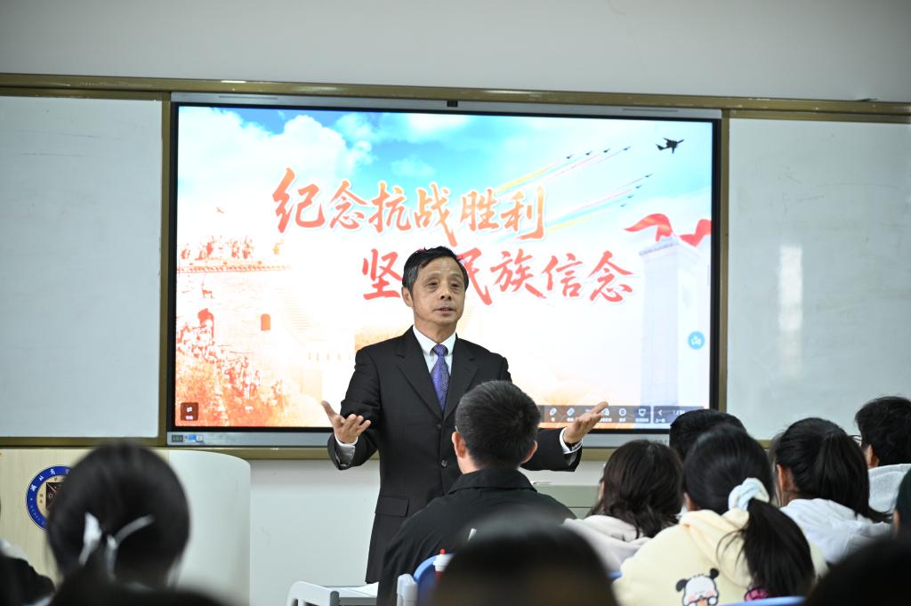 当话题引向“纪念抗战胜利”的课程主题时,他结合大量珍贵的历史图片、文献资料与英雄事迹,带领师生重温了中国人民抗日战争的艰辛历程——从九一八事变后的局部抗战,到七七事变后的全面抗战,从抗日民族统一战线的凝聚力量,到最终取得抗战胜利的伟大荣光。“在这场持续14年的艰苦卓绝斗争中,无数先烈用鲜血与生命铸就了‘天下兴亡、匹夫有责’的爱国情怀,‘百折不挠、坚忍不拔’的民族信念。”肖坤动情地说,“今天我们纪念抗战胜利,不仅是为了铭记历史、缅怀先烈,更是为了传承抗战精神,让其成为当代青年攻坚克难、奋勇前行的力量源泉。”