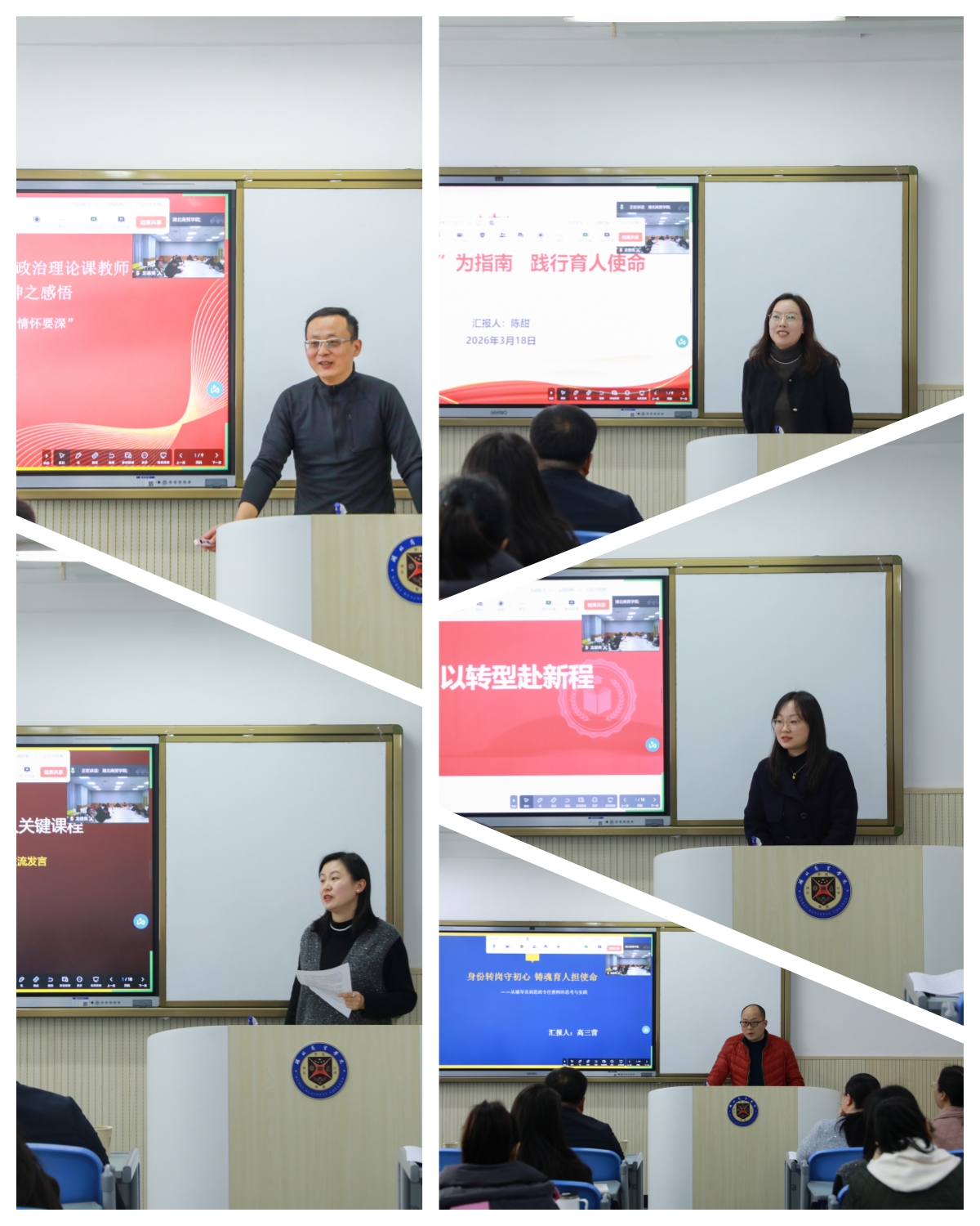 会上,5位新转任思政课教师结合学习“3.18”讲话精神和自身思想工作实际,分享了心得感悟。戚家斌以《学习习近平在学校思想政治理论课教师座谈会上讲话精神之感悟》为题,畅谈了对思政课教师使命担当的理解;陈甜以《以“六要”为指南 践行育人使命》为题,表达了以习近平总书记提出的“六要”标准严格要求自己的决心;钟蓉以《坚守铸魂育人初心 讲好立德树人关键课程》为题,阐述了讲好思政课的责任感与使命感;刘金萍以《以初心践使命 以转型赴新程》为题,分享了转岗以来的成长与收获;高三营以《身份转岗守初心 铸魂育人担使命》为题,表达了在新岗位上继续为党育人、为国育才的坚定信念。